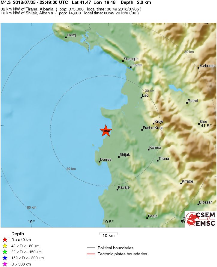 Sipas të dhënave nga EMSC, tërmeti me magnitudë 4.3 ka patur epiqendrën 32 km larg nga Tirana dhe 16 km larg nga Shijaku.