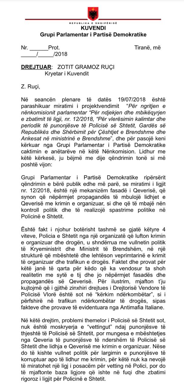 Përmes një letre që mban firmën e Kreut të Grupit Parlamentar demokrat, Edmond Spaho, PD njofton Kryetarin e Kuvendit, Gramoz Ruçi, mbi vendimin, ndërsa e konsideron proçesin një farsë.