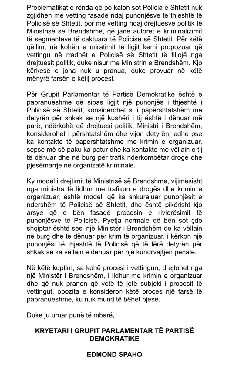 PD thekson se përsa kohë Ministria e Brendshme drejtohet nga ministra të lidhur me krimin e organizua, që nuk pranon të jetë pjesë e proçesit të Vettingut, atëherë kjo është një farsë, në të cilën PD nuk mund të bëhet pjesë.