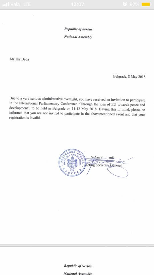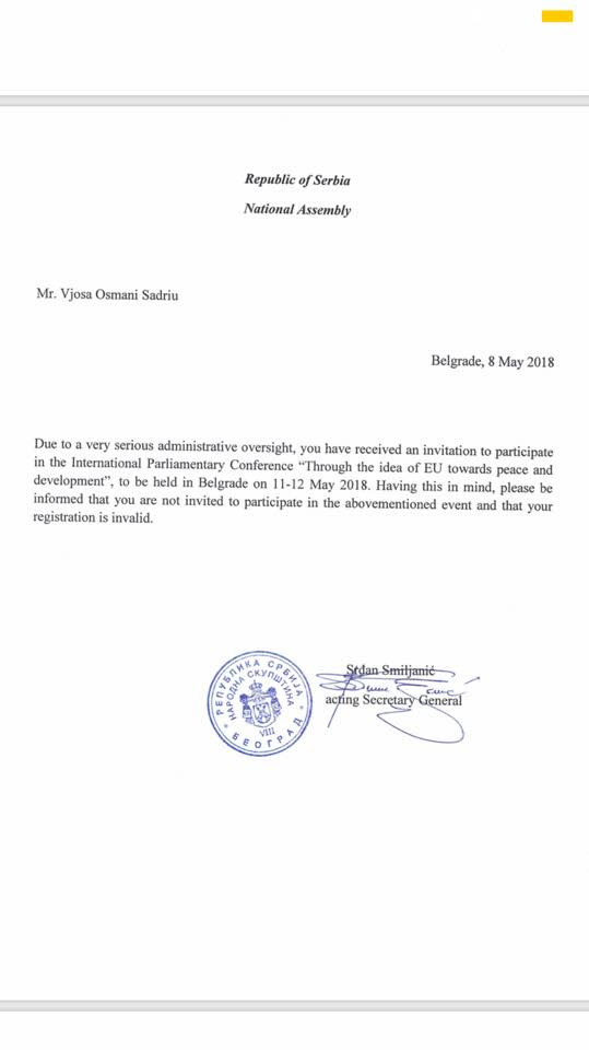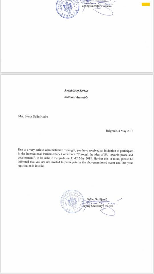 Deputetët e Kuvendit të Kosovës, Vjosa Osmani, LDK, Ilir Deda, Alternativa, si dhe Blerta Deliu-Kodra-PDK, kanë pranuar nga një letër nga Kuvendi i Serbisë, për t’u njoftuar lidhur me anulimin e pjesëmarrjes së tyre në konferencën “Përmes idesë së BE-së drejt paqes dhe zhvillimit” të paraparë të mbahet me 11-12 maj në Beograd.