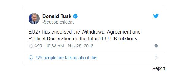 Marrëveshja e tërheqjes së Mbretërisë së Bashkuar nga Bashkimi Evropian është miratuar nga udhëheqësit e BE-së, njoftoi Presidenti i Këshillit Evropian, Donald Tusk përmes një postim në Twitter.