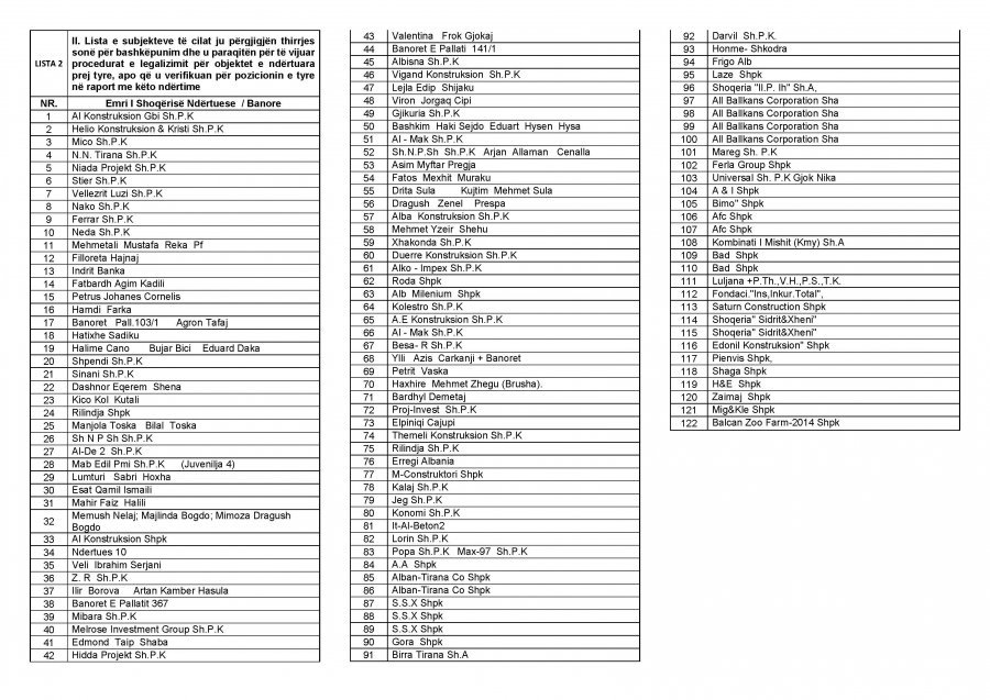 II. Lista e subjekteve të cilat ju përgjigjën thirrjes së ALUINIT për bashkëpunim dhe u paraqitën për të vijuar procedurat e legalizimit për objektet e ndërtuara prej tyre, apo që u verifikuan për pozicionin e tyre në raport me këto ndërtime. (122 subjekte).
