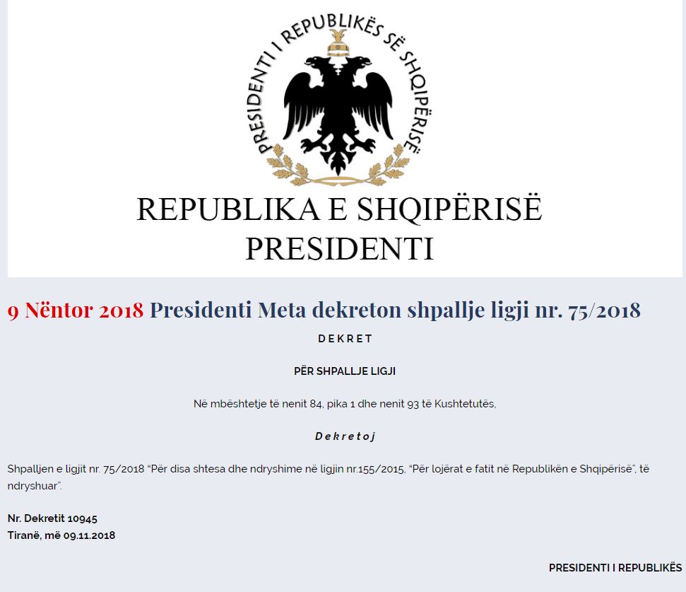 Presidenti i Republikës, Ilir Meta ka dekretuar ndryshimet në ligjin për Lojërat e fatit.