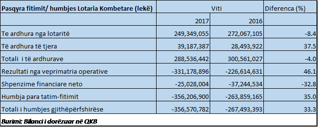 Lotaria Kombëtare e cila ka licencën ekskluzive për organzimin e lojrave të fatit me një afat 10 vjeçar nuk po rezulton me fat në aktivitetin e saj në Shqipëri. Kompania ka thelluar në vitin 2017 humbjen e saj duke e çuar në 356 milionë lekë (rreth 2.7 mnl euro) nga 263 milionë lekë që ishte në vitin 2016. Referuar të bilancit të vitit 2017 bërë publik nga kompania, totali i humbjes gjithëpërfshirëse u rrit me 33 për qind në raport me vitin paraardhës.