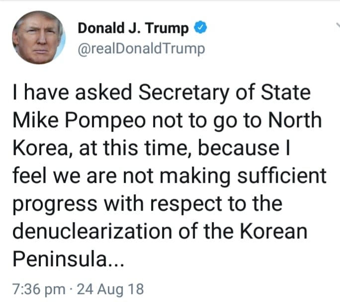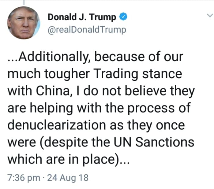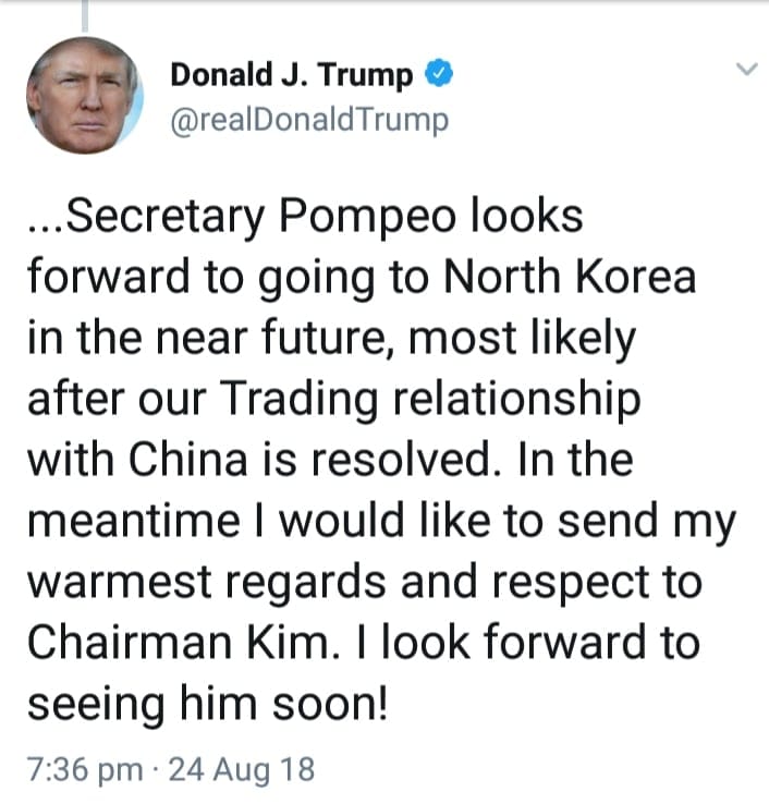 Presidenti Trump vazhdoi sqarimin me komunikimin e tij në rrjetin social duke shtuar se për shkak të qëndrimit shumë të ashpër tregtar amerikan me Kinën, ai nuk beson se po ndihmojnë në procesin e denukelarizimit sikur ishin dikur (pavarësisht sanksioneve me vend të OKB) por në një të ardhme të afërt Sekretari Pompeo do të shkoj në Korenë e Veriut, me shumë gjasa pasi marrëdhëniet tregtare me Kinën të jenë zgjidhur. Por kjo nuk zuri vend në shumicën e mediave botërore, dhe jo vetëm në CNN: