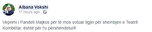 “Veprimi i Pandeli Majkos për të mos votuar ligjin për shembjen e Teatrit Kombëtar, është për t’u përshëndetur!!”, shkruan Vokshi në një postim në rrjet.