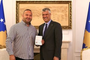 “Në mënyrë solemne, sot kam ndarë pasaportën diplomatike për xhudisten e artë, Majlinda Kelmendin, për trajnerin, Driton Kuka, dhe kryetarin e Federatës së Xhudos, Agron Kuka”, ka bërë të ditur Thaçi përmes rrjetit social Facebookj, duke i bashkëngjitur fotografitë e rastit të ndarjes së pasaportave.