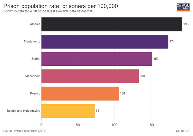 Në vendet e Ballkanit Perëndimor pas Shqipërisë, për numër të lartë të burgosurish, renditet Mali i Zi me 174 të burgosur për 100 mijë banorë, e ndjekur nga Serbia me 174 të burgosur për 100 mijë banorë, Maqedonia me 134 të burgosur për 100 mijë banorë.