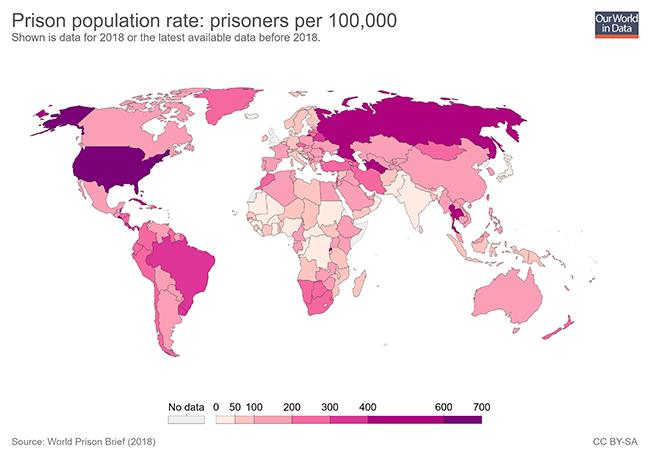 Numrin më të lartë të të burgosurve në të gjithë botën për vitin 2018 e kanë Shtetet e Bashkuara të Amerikës ku sipas të dhënave të publikuara për 100 mijë banorë kishte 655. Edhe vendet e Amerikës Latine kanë një numër të lartë të burgosurish, ndërsa numrin më të lartë e ka Brazili me 323 të burgosur për 100 mijë banorë.