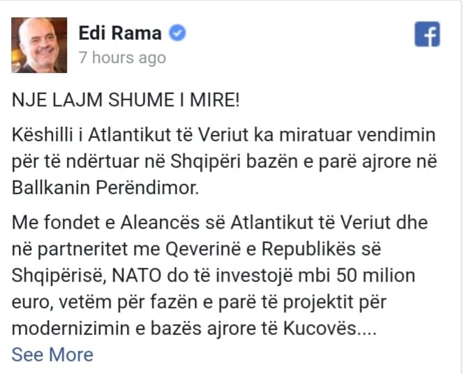 Kryeministri i Shqipërisë Edi Rama, përmes një postimi në rrjetin social Facebook ka bërë të ditur se Këshilli i Atlantikut të Veriut ka miratuar vendimin për të ndërtuar në Shqipëri bazën e parë ajrore në Ballkanin Perëndimor.