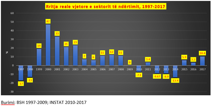 Sipas të dhënave zyrtare nga INSTAT, sektori i ndërtimit u zgjerua me 10.4% më 2017. Ritmet e rritjes u trefishuan në raport me vitin 2016, duke iu afruar trendit të pas vitit 2005 (shih Grafikun e mëposhtëm).