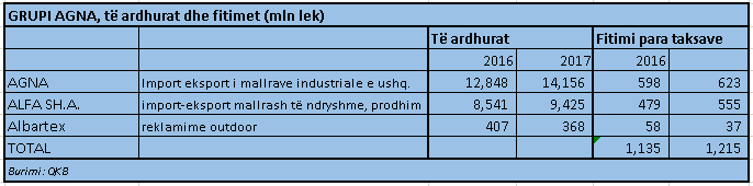 Dy kompanitë kryesore të grupit, Agna sh.a. (shpërndarës produktesh dhe investues), Alfa sh.a. (ambalazhues i Pepsi, Ivi, 7Up, Lipton Ice Tea; prodhues i Glina dhe Spring; shpërndarës i Heineken, Amstel, Alfa Beers, Tsantali Wines dhe Shark Energy Drink), realizuan për vitin 2017 fitime prej 1.2 miliardë lekësh, me një rritje prej 9.4% me bazë vjetore.