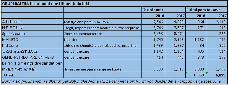 Balfin është grupi me fitime më të mëdha në vend. Në total, në vitin 2017, përfshirë dhe dividendët që merren nga investimet në kompanitë jashtë (grupi Balfin), fitimet e Balfin ishin rreth 6 miliardë lekë, ose rreth 45 milionë euro, me një rënie të lehtë, ku efektin kryesor e dha ndërtimi dhe fitimet jashtë (vitin e kaluar shitja e aksioneve të Skopje City Mall rriti fitimet e grupit nga aktiviteti jashtë vendit).