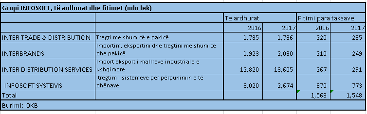 Katër kompanitë e grupit Infosoft-Joti (që ka aktivitet në fushën e tregtimit dhe informatikës), INFOSOFT SYSTEMS, INTER TRADE & DISTRIBUTION, INTERBRANDS, INTER TRADE & DISTRIBUTION, kishin fitime prej 1.5 miliardë lekësh në 2017-n (rreth 11 milionë euro), pothuajse e pandryshuar në raport me 2016-n.