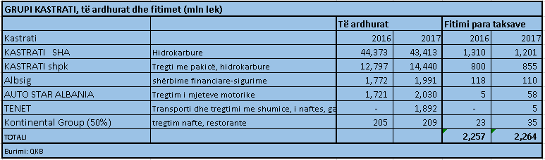 Kastrati është grupi më i madh sa i përket xhiros, por i dyti për fitime, eksa tregtimi i naftës, që është aktiviteti bazë, rezulton me përfitueshmëri të ulët. Tre kompanitë kryesore të grupit KASTRATI SH.A. (tregtim me shumicë i naftës), KASTRATI (tregtim me pakicë i naftës) dhe Alb-Siguracion (sigurime) rezultuan me një fitim prej 2.16 miliardë lekësh (16 milionë euro), me një rënie prej 3% me bazë vjetore.