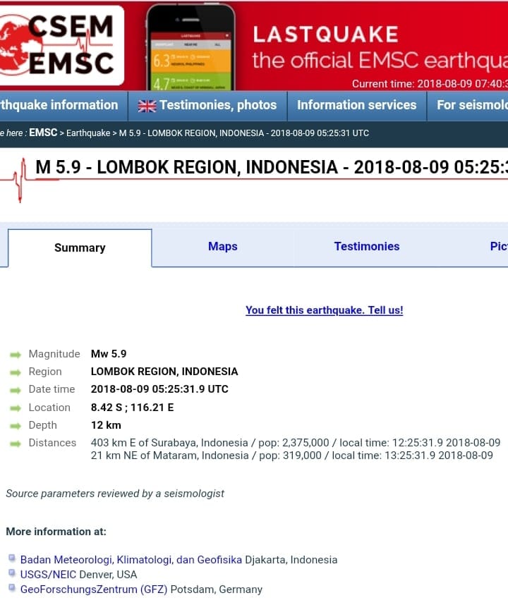 Ndërkohë Qendra Mesdhetare Sizmiologjike, EMSC, raporton për një tërmet me fuqi prej 5.9 ballësh, me thellësi 12 km, vetëm 21 km larg Mataramit.