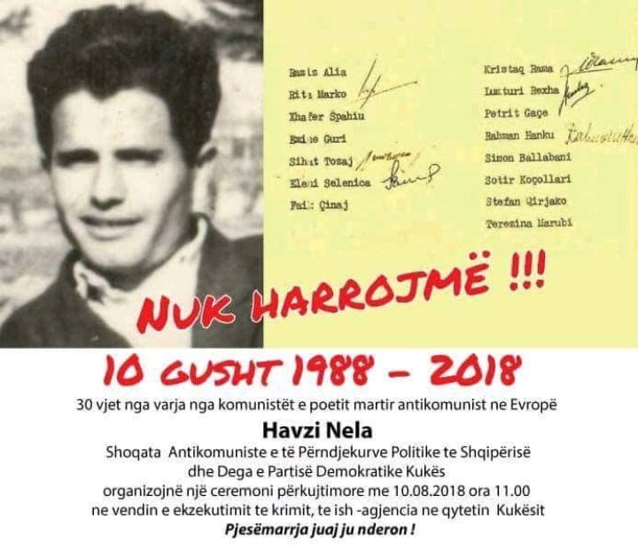 Në kuadër të aktiviteteve në përkujtim të 30 vjetorit të varjes nga komunistët të poetit martir antikomunist në Evropë, Havzi Nela,