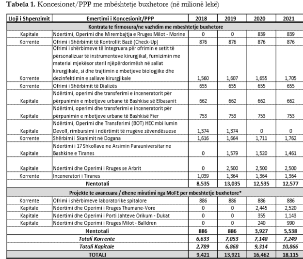 Pagesat buxhetore ndaj kompanive që janë në kontrata partneriteti Publik-Privat me qeverinë nëpërmjet koncensioneve PPP do të dyfishohen deri më 2021, sipas parashikimeve të vetë qeverisë.
