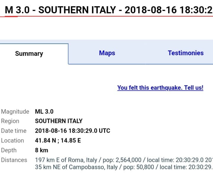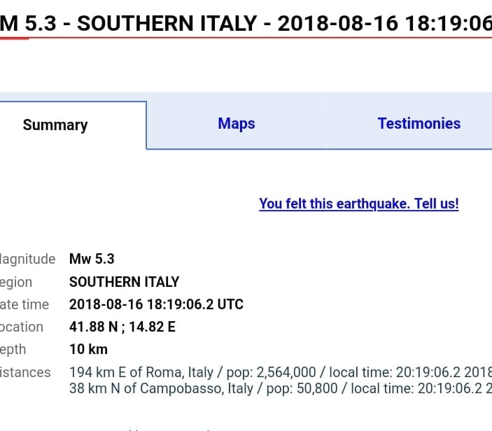Ndërkohë Qendra Sizmiologjike Mesdhetare, EMSC, duke raportuar për tërmetet që goditën Italinë thesksoi se më I fuqishmei ishte 5.3 ballë dhe ai më I dobëti 3.0 që të gjitha në rajonin Campobasso dhe me thellësi prej 8-10 kliometra.
