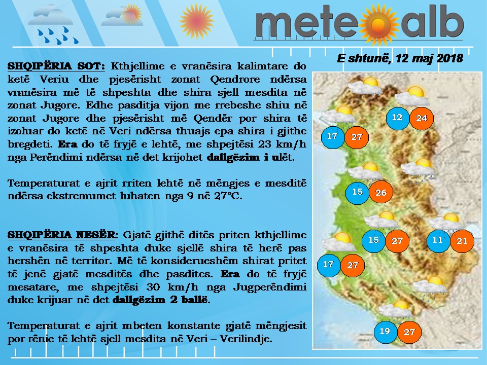 Parashikimi i motit për datën 12 Maj KryesoretRisi By Pa frike Last updated Maj 12, 2018 115 moti parashikimi meteoalb 115 Ndaj FacebookTwitterLinkedinGoogle+