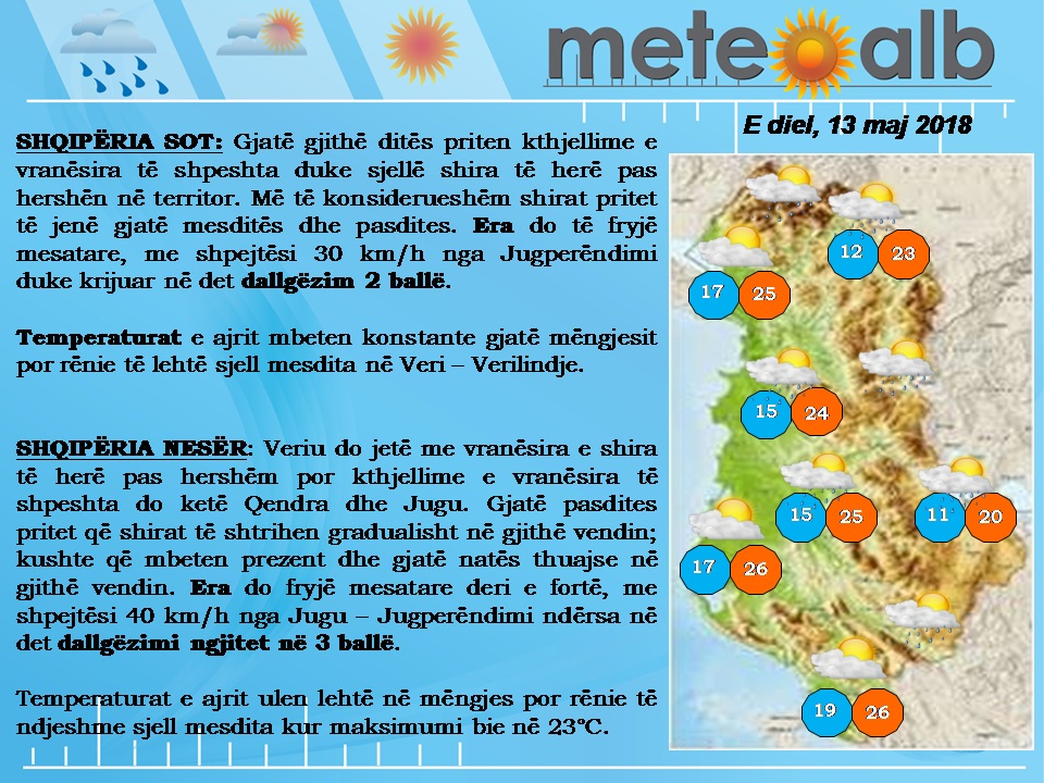 Parashikimi i motit për datën 13 Maj KryesoretRisi By Pa frike Last updated Maj 13, 2018 94 moti parashikimi shi ere diell meteoalb atmosferike 94 Ndaj FacebookTwitterLinkedinGoogle+