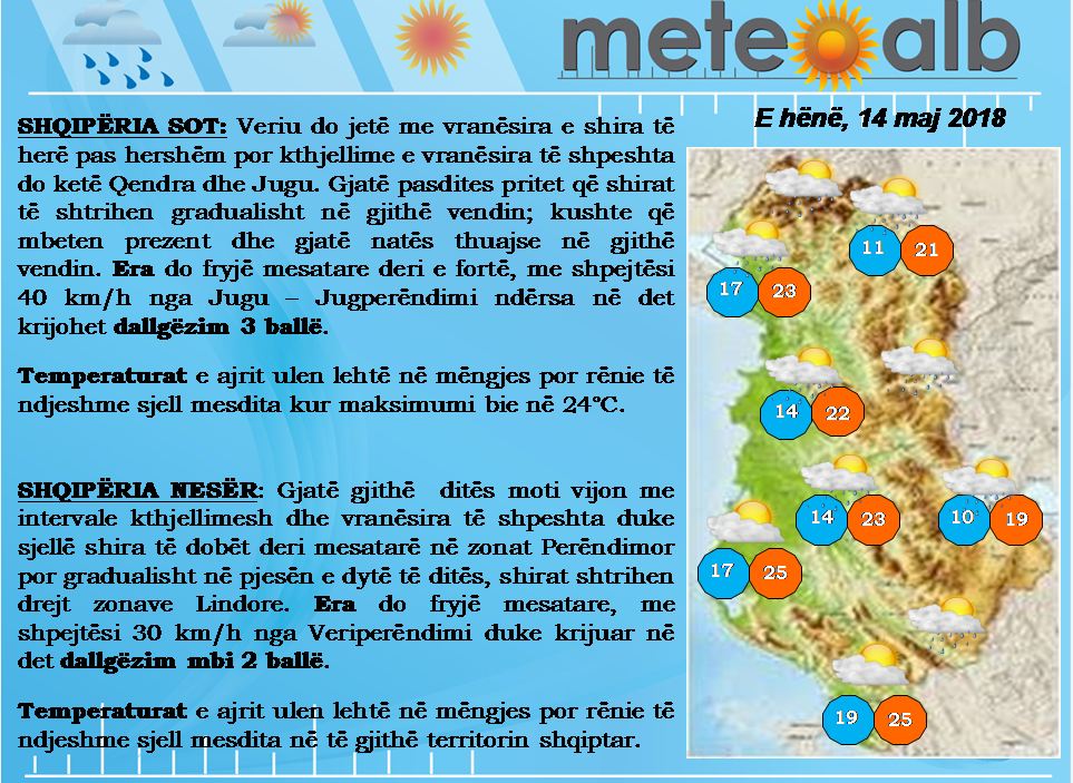Parashikimi i motit për datën 14 Maj KryesoretRisi By Pa frike Last updated Maj 14, 2018 149 parashikimi moti meteoalb kushtet atmosferike 149 Ndaj FacebookTwitterLinkedinGoogle+