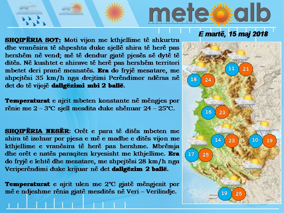 Parashikimi i motit për datën 15 Maj KryesoretRisi By Pa frike Last updated Maj 15, 2018 117 moti parashikimi meteoalb 117 Ndaj FacebookTwitterLinkedinGoogle+