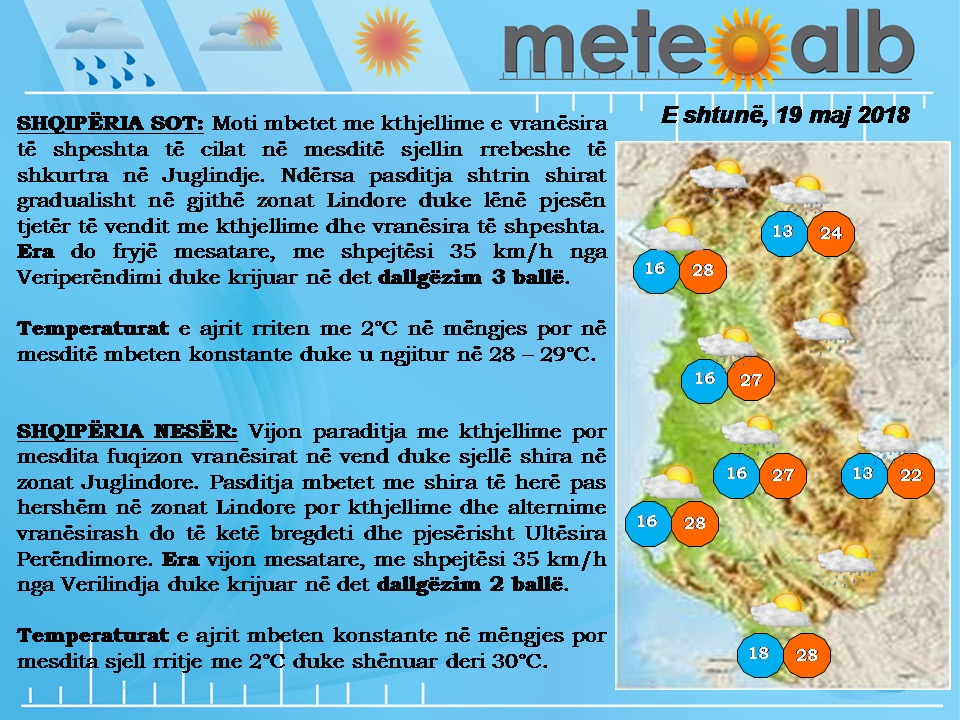 Parashikimi i motit për datën 19 Maj KryesoretRisi By Pa frike Last updated Maj 19, 2018 87 motiparashikimitemperatura 87 Ndaj FacebookTwitterLinkedinGoogle+