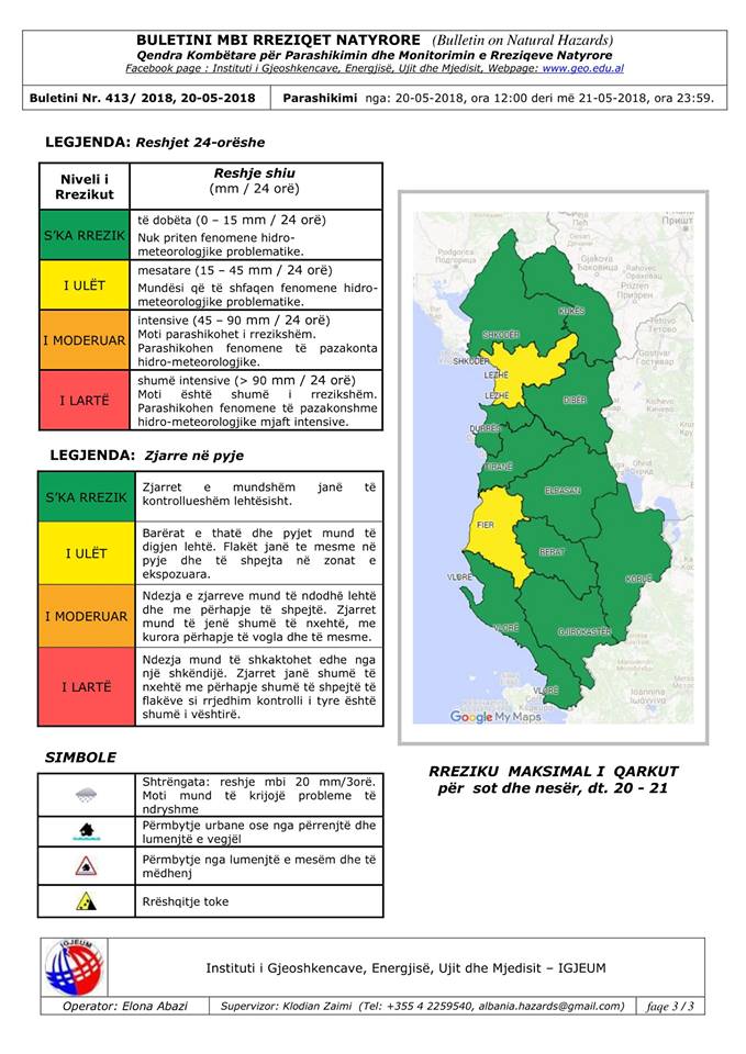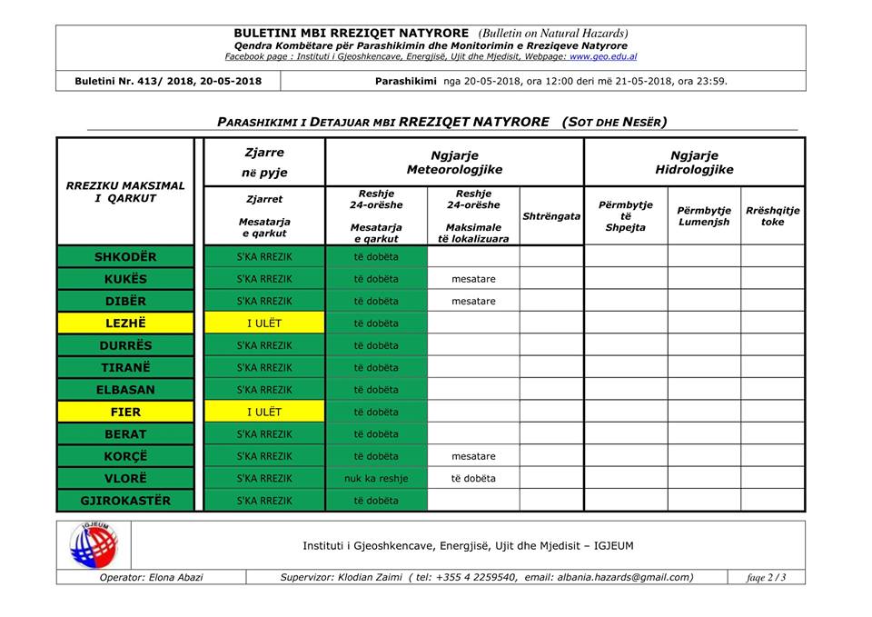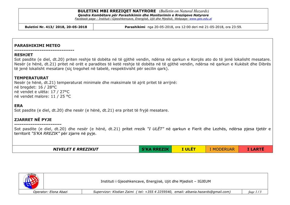 Sot e hënë, dt.21 maj, pritet në orët e paradites të ketë reshje të dobëta në të gjithë vendin, ndërsa në qarkun e Kukësit dhe Dibrës të jenë lokalisht mesatare (siç tregohet në tabelë, respektivisht për secilin qark).