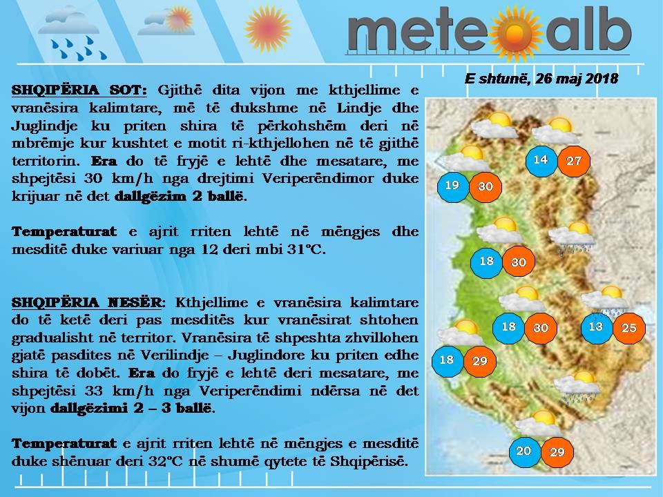 Sot (e shtunë, dt.26) temperaturat minimale dhe maksimale të ajrit pritet të arrijnë: