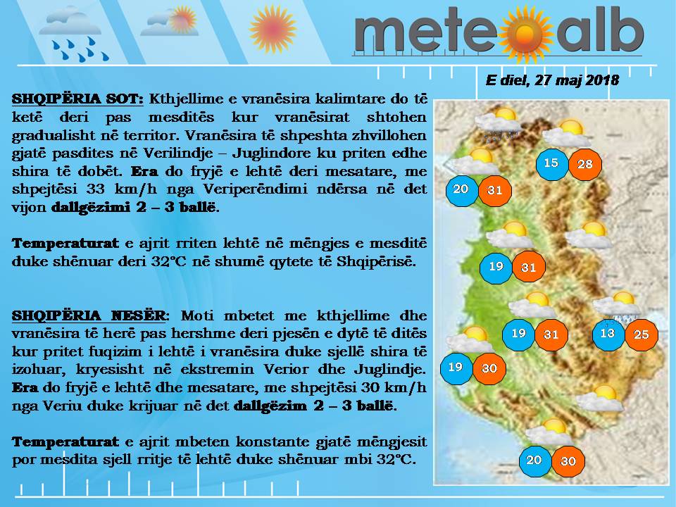 Sot (e diel, dt.27) pritet të ketë reshje të dobëta në pjesën më të madhe të qarqeve. Lokalisht reshjet mund të jenë në formë shtrëngate, kryesisht në zonat malore në lindje.