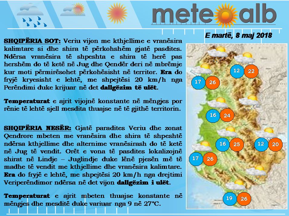Parashikimi i motit për datën 8 Maj KryesoretRisi By Pa frike Last updated Maj 8, 2018 44 Veriu vijon me kthjellime dhe vranësira kalimtare si dhe shira të përkohshëm gjatë pasdites. Meteoalb parashikon që vranësira të shpeshta e shira të herëpashershëm do të ketë në Jug dhe në Qendër. moti parashikim meteoalb 44 Ndaj FacebookTwitterLinkedinGoogle+