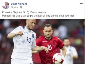 “Kosovë – Shqipëri (3 : 0). Bravo Kosova! Panuçi një sharlatan që po shkatërron dhe atë që ishte ndërtuar.”, ka qenë ky reagim i Nishanit pas ndeshjes.