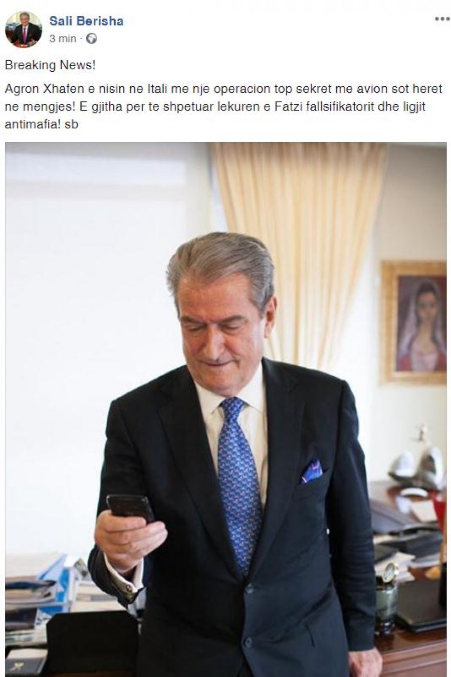 Mirëmëngjes Dr Agron Xhafën e nisën forcërisht në Itali me një operacion top sekret me avion sot herët në mëngjes! Letra është shkrojtur nga Fatziu!E gjitha për të shpëtuar lekurën e Fatzi fallsifikatorit dhe ligjit antimafia!”, poston Berisha në rrjetin social.