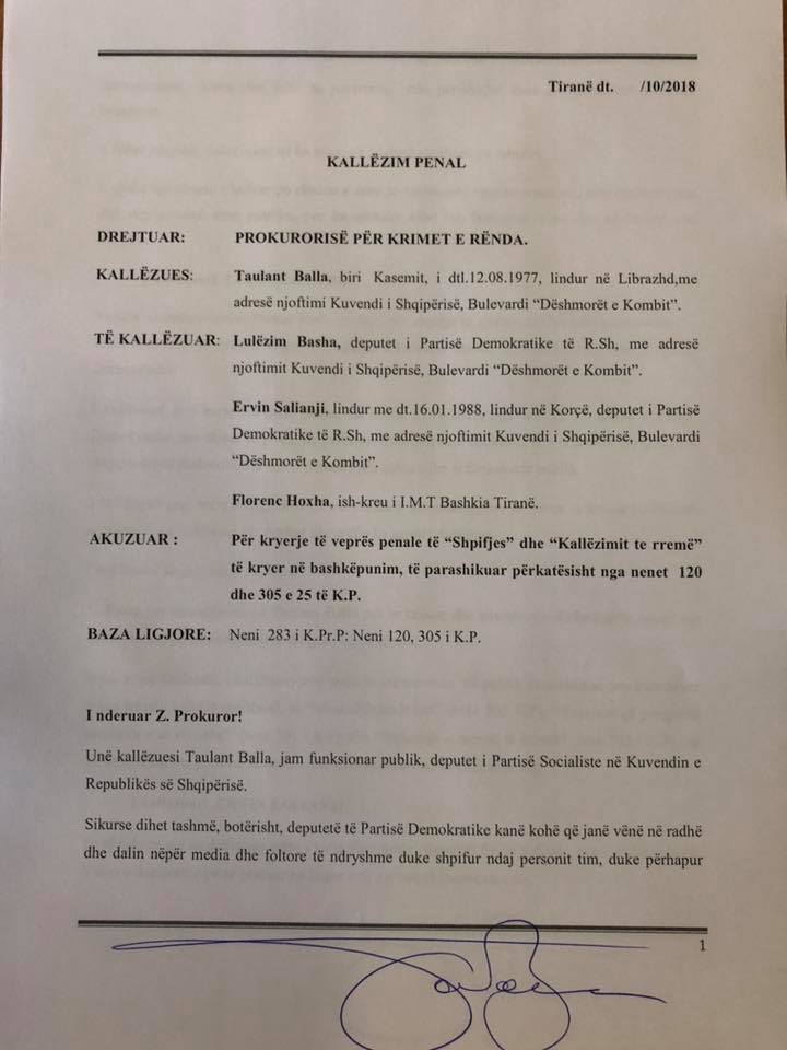 Pas rrëfimit të dështuar në “Opinion” ku nuk arriti të bindë as Blendi Fevziun sepse për opinionin publik as që bëhet fjalë, në mëngjes Kryetari i Grupit Parlamentar të PS, Taulant Balla mbërriti në Prokurorinë e Krimeve të Rënda për të depozituar padinë e re ndaj kreut të PD, Lulzim Basha, deputetit demokrat Ervin Salianji dhe ish-kreut të policisë bashkiake Florenc Hoxha.