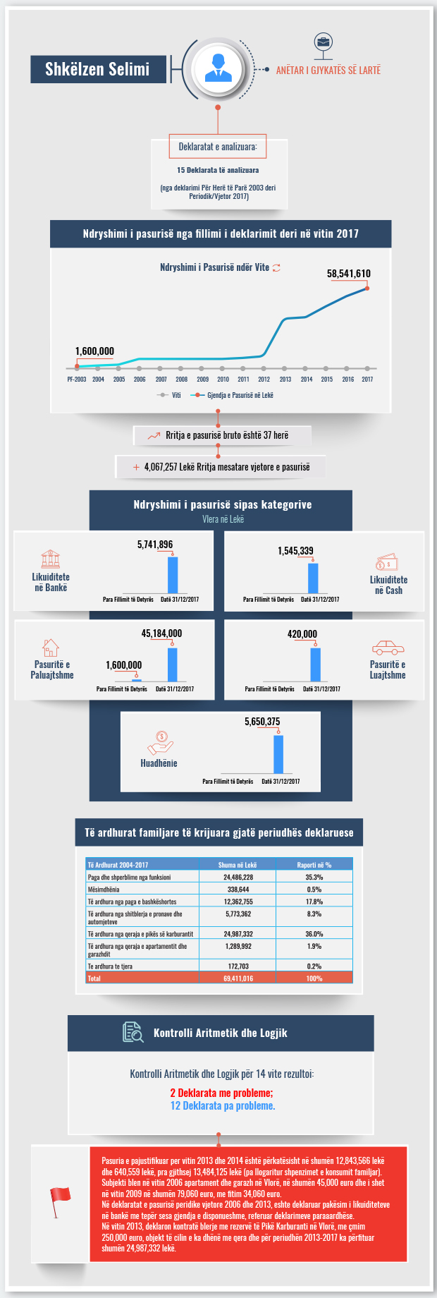 Të dhënat e analizuara nga BIRN tregojnë se gjyqtari Shkëlzen Selimi zotëronte pasuri me vlerë 1.6 milionë lekë në vitin 2003-kur deklaroi për herë të parë në Inspektoriatin e Lartë të Deklarimit dhe Kontrollit të Pasurive. Referuar deklaratës së tij të parë, Selimi zotëronte vetëm 25 për qind të një apartamenti të familjes, të përfituar nga ligji i privatizimeve.