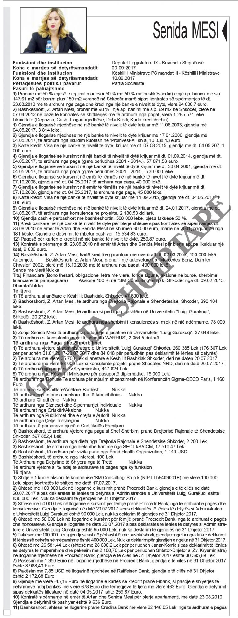 Zbardhen pasuritë e kabinetit “Rama 2”. Kryeministri Edi Rama ka deklaruar të ardhurat nga rroga, nga honoraret dhe fitimet nga shitja e pikturave. Zëvendëskryeministra Senida Mesi dhe bashkëshorti i saj disponojnë 14 llogari bankare, dy apartamente dhe automjet. Bashkëshorti zëvendëskryeministres zotëron 100% të aksioneve të një kompanie.