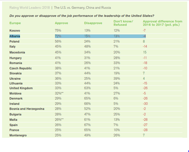 Nivelet më të ulëta të aprovimit të vendimeve dhe performancës si president të Donald Trump e kanë vendet anëtare të NATO-s, si dhe Rusia dhe vendet e tjera Lindore që kanë praninë e trupave amerikane në territoret e tyre.