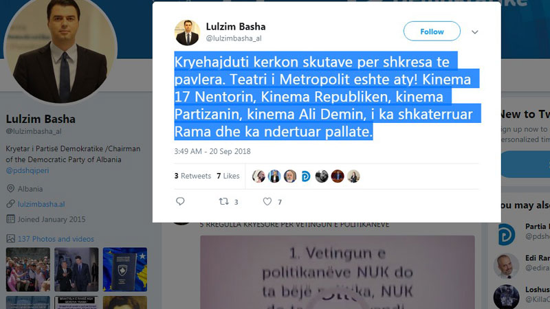 “Kryehajduti kërkon skutave për shkresa të pavlera. Teatri i Metropolit është aty! Kinema 17 Nëntorin, Kinema Republikën, kinema Partizanin, kinema Ali Demin, i ka shkatërruar Rama dhe ka ndërtuar pallate,” theksoi kryetari i Partis Demokratike, Lulzim Basha përmes rrjetit social “Twitter” duke ju përgjigjur Edi Ramës për akuzat e thëna nga foltorja e Parlamentit të Shqipërisë.