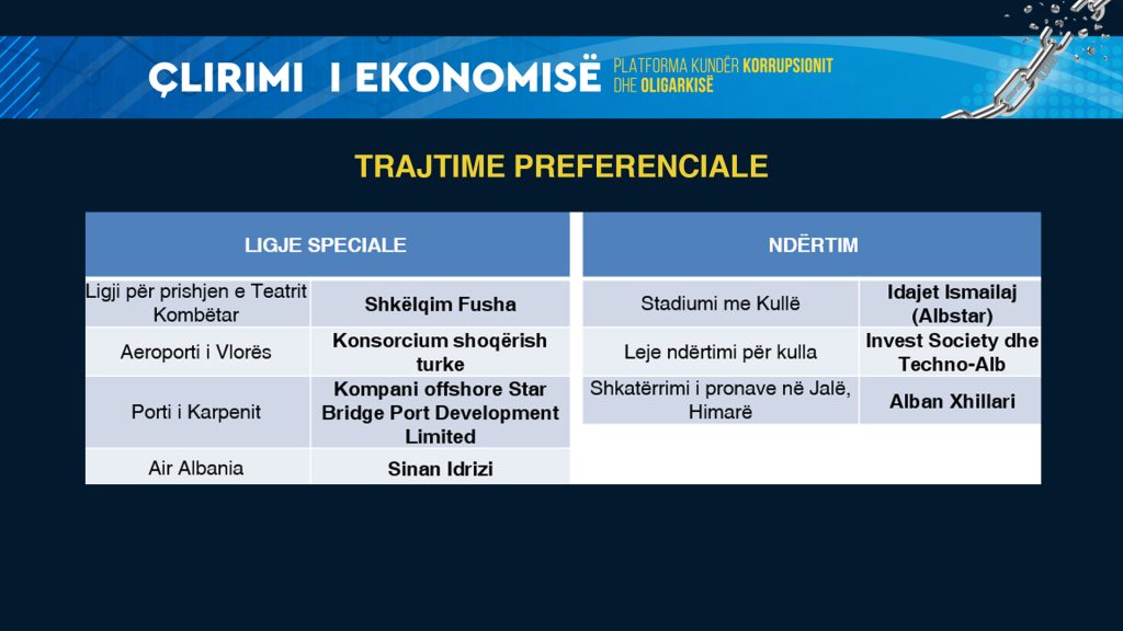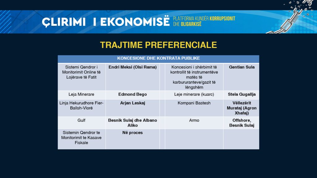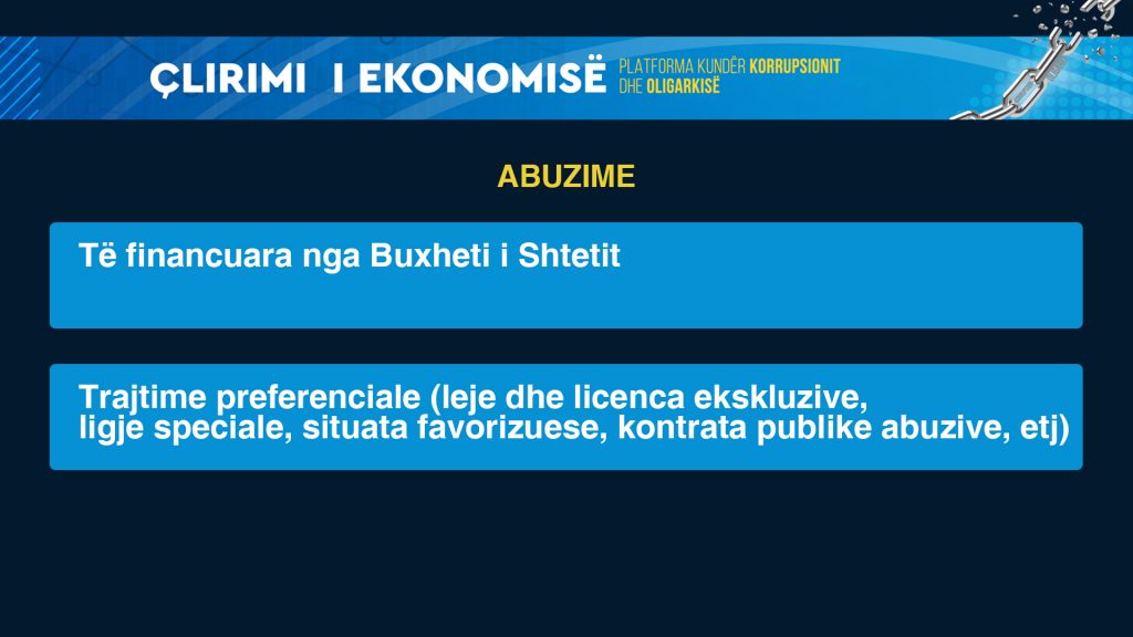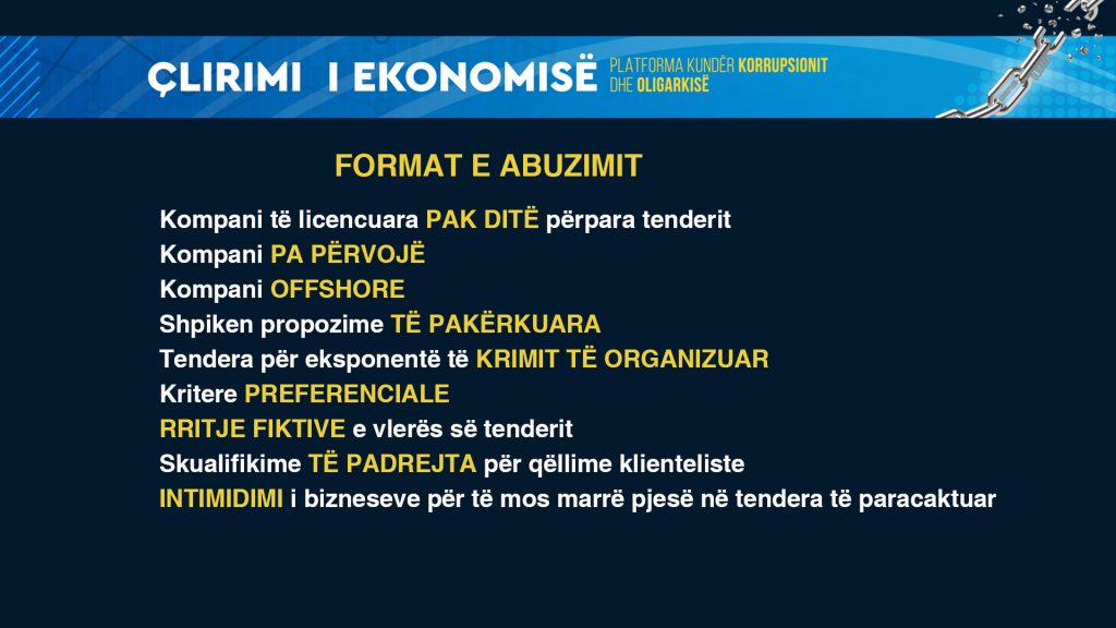 Elementi i parë është se janë kompani të krijuara pak ditë më herët, kompanji offshore, kritere preferenciale, rritje fictive të tenderave, indimidim të kompanive të tjera, kompani pa përvojë.