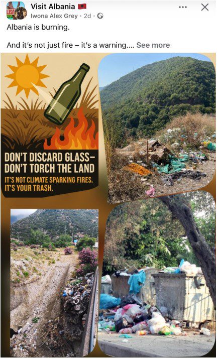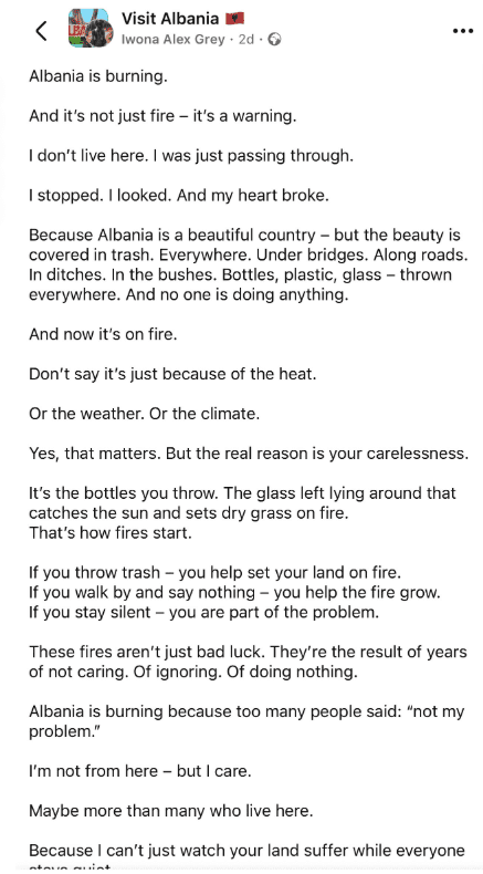 Kjo sepse Shqipëria është një vend i bukur, por kjo bukuri është e mbuluar me plehra. Kudo! Nën ura, përgjatë rrugëve, në kanale, në shkurre. Shishe, plastika, gota, të hedhura kudo dhe askush nuk bën asgjë. Tani ka marrë flakë dhe mos thoni që është vetëm nga i nxehti, nga koha apo klima. Po, këto ndikojnë, por arsyeja e vërtetë është neglizhenca juaj.”