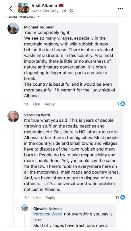 Michael T komentoi: “Ke shumë të drejtë. Shohim kaq shumë fshatra, sidomos në zonat malore, ku pas shtëpive ka male me mbeturina. Ka mungesë të infrastrukturës së mbetjeve në këtë vend. Por për më tepër, ka shumë pak ose aspak ndërgjegjësim për natyrën dhe mbrojtjen e saj. Është zakonisht e neveritshme të endesh nëpër parkime makinash nëse te duhet të pushosh. Vendi është i bukur dhe do të ishte edhe më shumë, nëse s’do të kishte këtë ‘anë të shëmtuar’ të Shqipërisë.”
