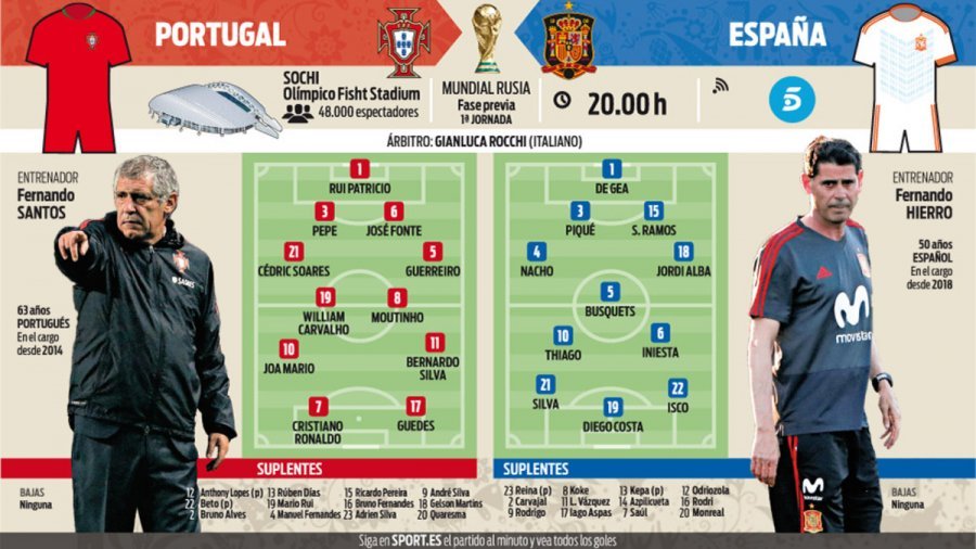 Sot në mbrëmje do të luhet ndeshja ndërmjet Portugalisë dhe Spanjës e vlefshme për Grupin B në Kampionatin Botëror “Rusi 2018”. Mediat spanjolle kanë publikuar formacionet e dy skuadrave, ndërsa Cristiano Ronaldo ka paralajmëruar Spanjën për humbjen që do të pësojnë.