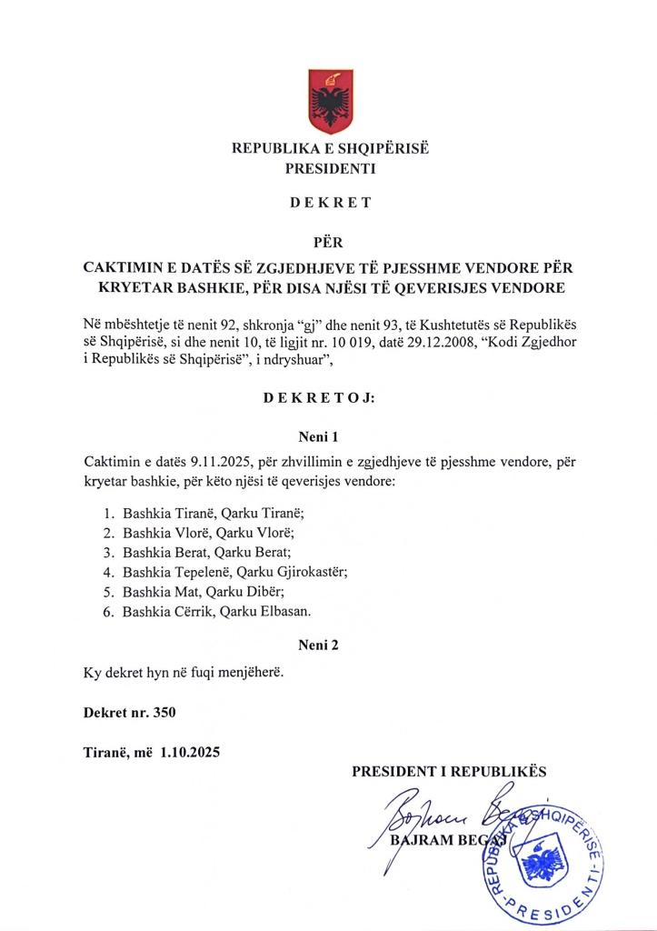 Presidenti i Republikës dekretoi sot ditën e dielë, datë 9 nëntor 2025, si datën për zhvillimin e zgjedhjeve të pjesshme për kryetar bashkie për bashkitë Tiranë, Vlorë, Berat, Mat, Tepelenë dhe Cërrik, pas marrjes së njoftimit për vakancat nga Këshilli i Ministrave në datën 30 shtator 2025.
