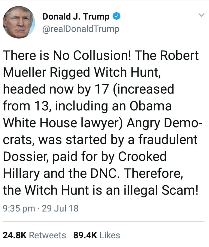 “Nuk ka bashkëpunim! Gjuetia e shtrigave e Robert Mueller-it, e udhëhequr nga 17 demokratë të zemëruar (ishin 13, duke përfshirë këtu avokatin e Shtëpisë së Bardhë të Obamës) , filloi me një dosje të pandershme, të paguar nga Hillary dhe Komiteti Kombëtar Demokrat,” shkruan sot në rrjetin social Twitter, Presidenti amerikan, Donald Trump, lidhur me ndërhyrjen e dyshuar ruse në zgjedhjet e fundit presidenciale në SHBA.
