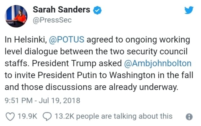 Ndërkohë zëdhënësja e Shtëpisë së Bardhë, Sarah Huckabee Sanders, shkroi në Twitter se Presidenti Trump ka kërkuar nga Këshilltari i Sigurisë Kombëtare, John Bolton që në vjeshtë ta ftojë Putinin në Washington.