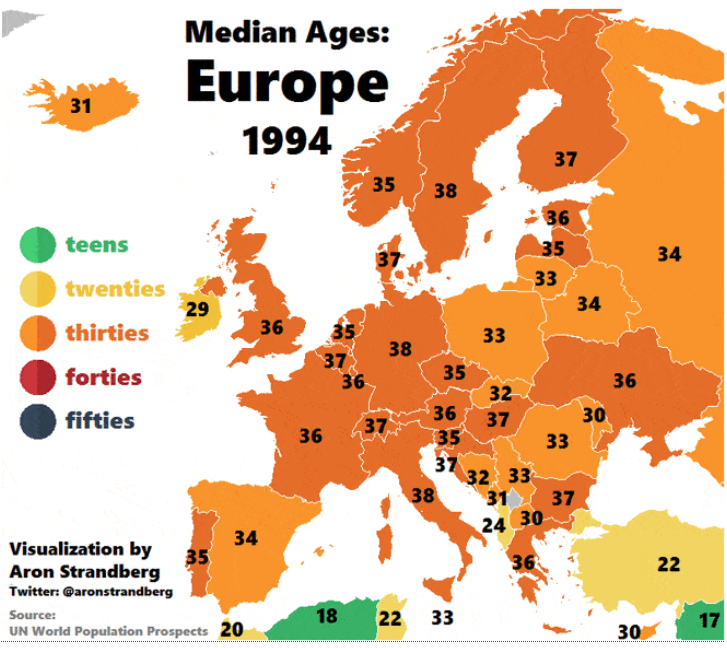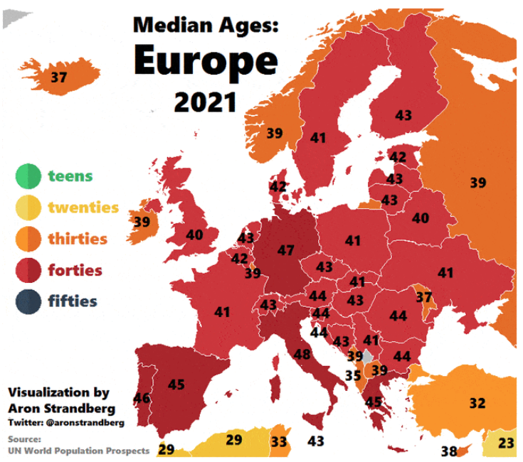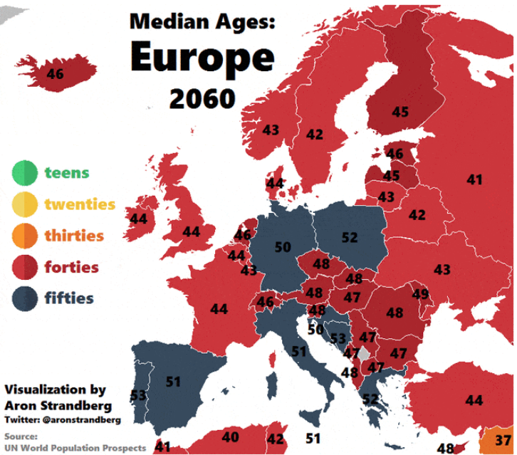 Europa prej vitesh ka hyrë në ciklin e plakjes së popullsisë. Projeksionet për vitet e ardhshme nuk janë aspak optimiste. Pas një dekade, projeksionet e Kombeve të Bashkuaratregojnë se në disa vende europiane mosha mesatare do të jetë 50 vjeç e lartë. Këtu përfshihen vende si Italia, Portugalia, Greqia, dhe më pas Gjermania, Polonia, Bosnja dhe Kroacia./Monitor/
