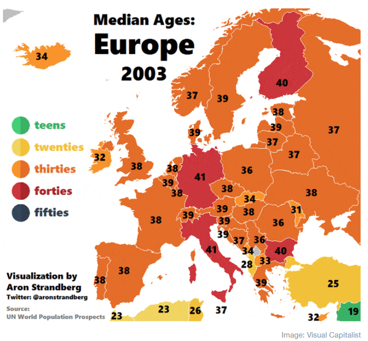 Në fillim të viteve 2000, mosha mesatare do të rritej për të gjithë Europën. Italia dhe Gjermania do kishin plakjen më të shpejtë me moshë mesatare prej 41 vjeç.
