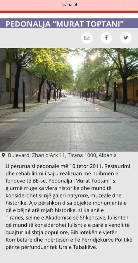 Gjithashtu ky vendim pervecse harxhon para te tjera nga taksat tona, edhe hedh ne kosh ato te taksapaguesve europiane ve edhe ne rrezik trashegimine tone kulturore. Vete bashkia Tirane ne webin e saj, shkruan per pedonalen “ka vlera historike dhe mund të konsiderohet si një galeri natyrore, muzeale dhe historike” (foto nga webi bashkise)