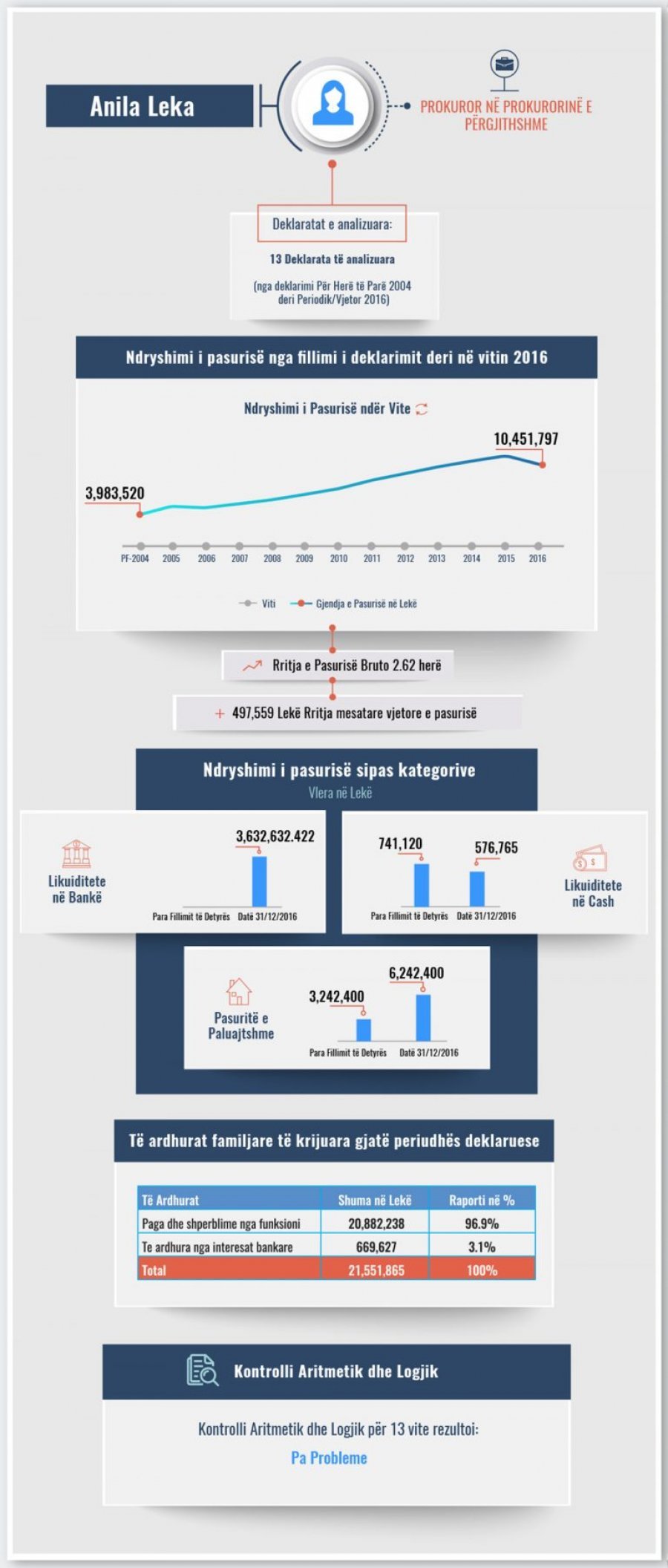 Përveç analizës për rritjen/uljen e pasurisë, strukturën e aseteve dhe të ardhurave, ky raport paraqet dhe kontrollin artimetik/logjik të deklarimeve të subjektit si dhe “flamujt e kuq’ që identifikohen gjatë kontrollit. Në rastin e zonjës Leka iu nënshtruan kontrollit aritmetik-logjik 13 deklarata pasurie dhe asnjëra prej tyre nuk rezulton me probleme.